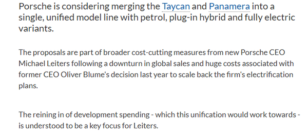 跟着诞生专用电动车型的资本握续挤压利润空间,保时捷正在再行评估将Panamera和Taycan当作两个都备颓靡工程技俩进行诞生的弥远可行性。讯息东谈主士显现,保时捷已入辖下手究诘如安在两者之间拆伙更高进度的零部件分享,并探讨赋予其一个共同的居品象征的可能性,即便往时车型可能继续沿用不同的本领平台。